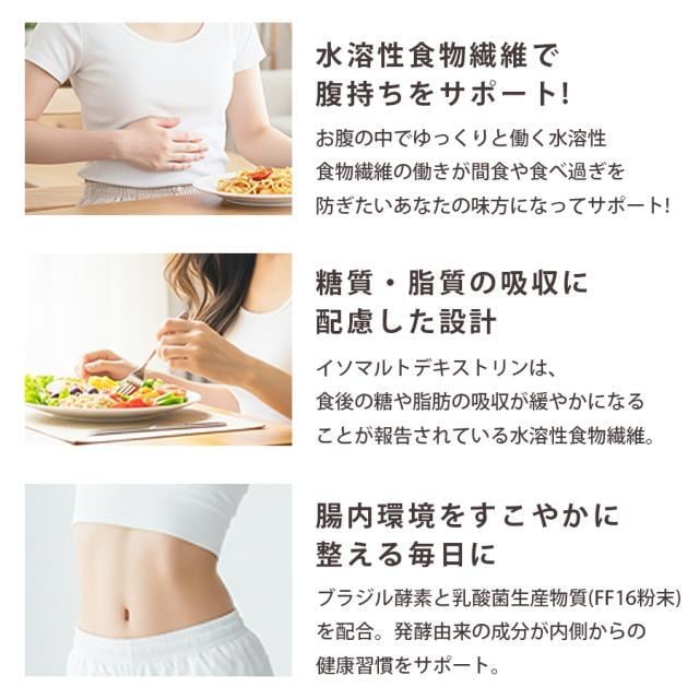 水溶性食物繊維「ファイバリクサ®」に加え、植物発酵エキス「ブラジル酵素」や乳酸菌生産物質「FF16」など、多角的なアプローチを叶える成分を厳選して配合。
