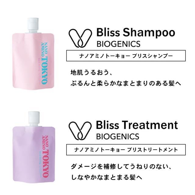 ナノアミノトーキョー ブリスシャンプーとトリートメントのトライアルセット。頭皮ケアもできる濃密泡で洗うシャンプーと、トステア®配合でうねりケアも叶うトリートメントのセットで、ぷるんとまとまる髪に。