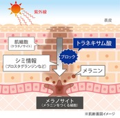 トラネキサム酸は、その情報伝達物質のひとつである「プロスタグランジン」などをブロックし、メラニンの生成を抑えます。