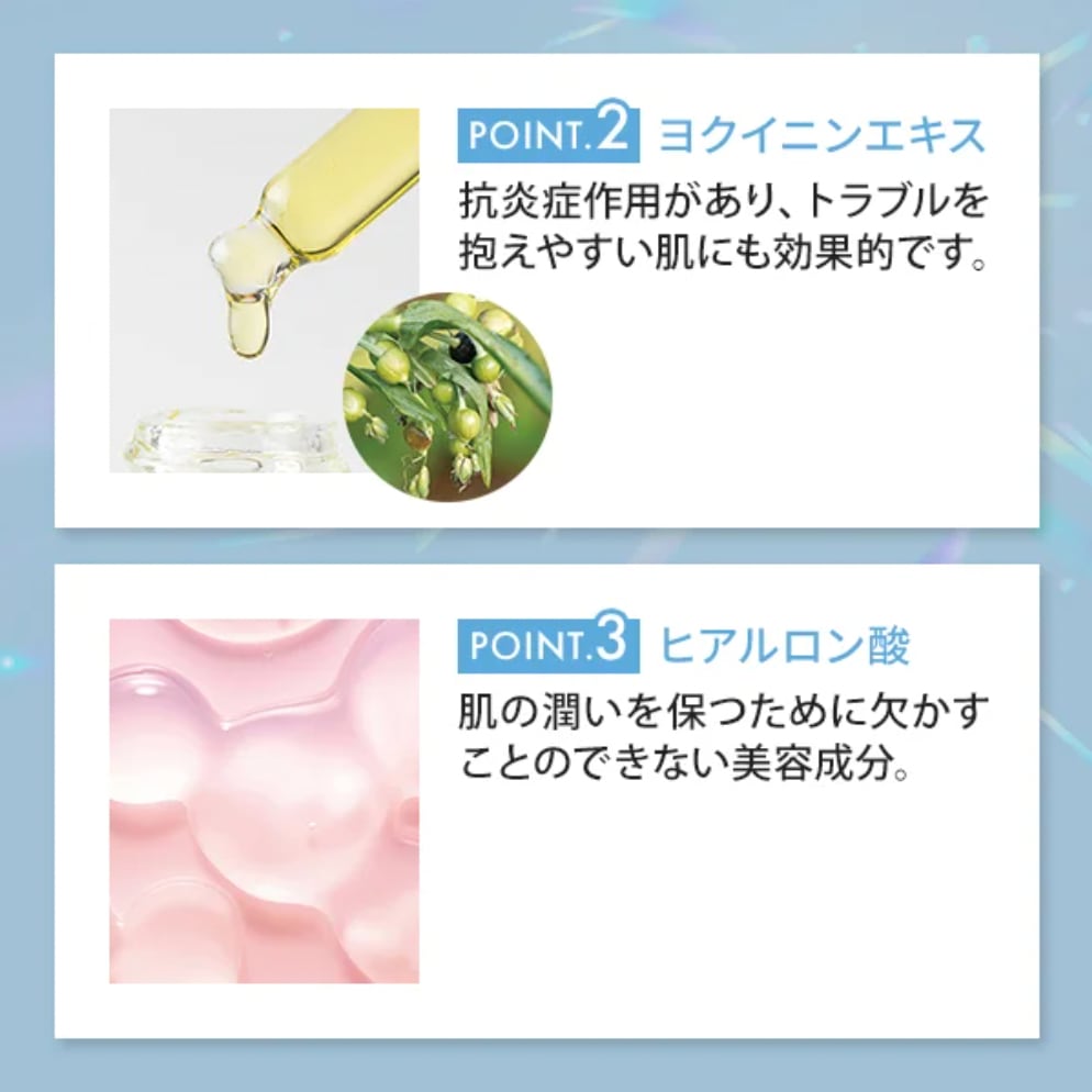 美白だけでなく肌にハリを与えるエイジングケア効果、さらに美肌作りに欠かせない潤いをたっぷり届けます。