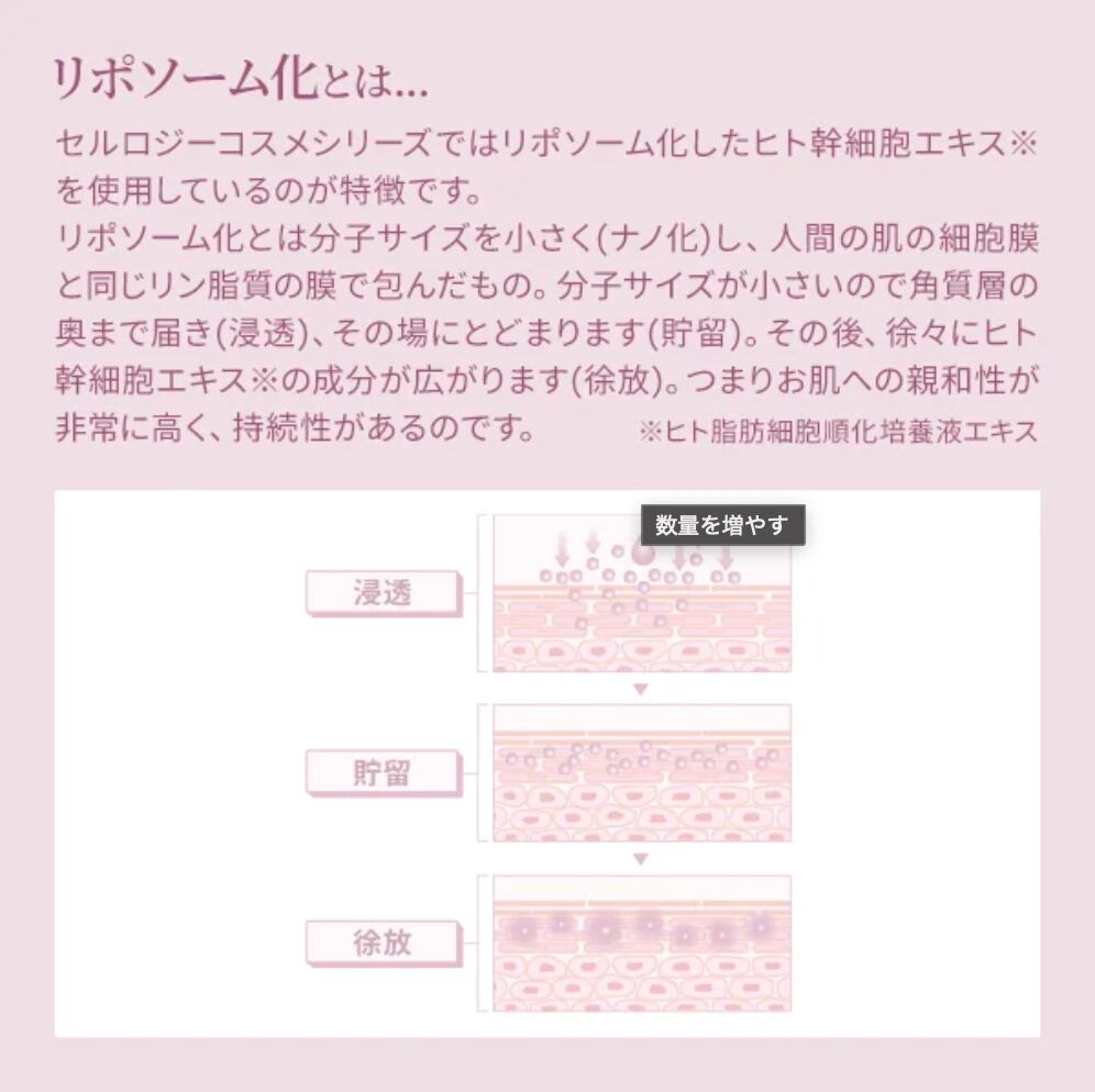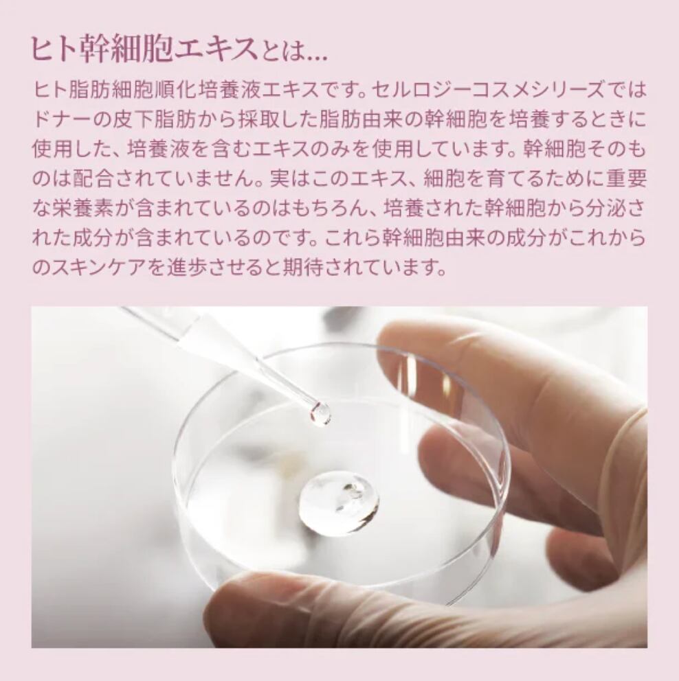 (*1 ヒト脂肪細胞順化培養液エキス/保湿成分、*2 年齢に応じたケア、*3 加水分解ヒアルロン酸、アセチルヒアルロン酸Na、ヒアルロン酸Na/すべて保湿成分、*4 水溶性コラーゲン、加水分解コラーゲン/すべて保湿成分、*5 サッカロミセス溶解質エキス/保湿成分)