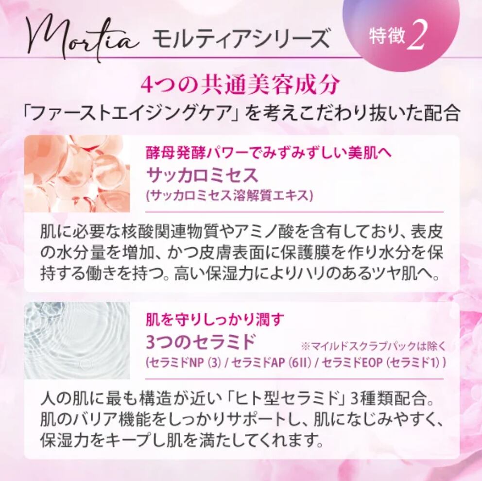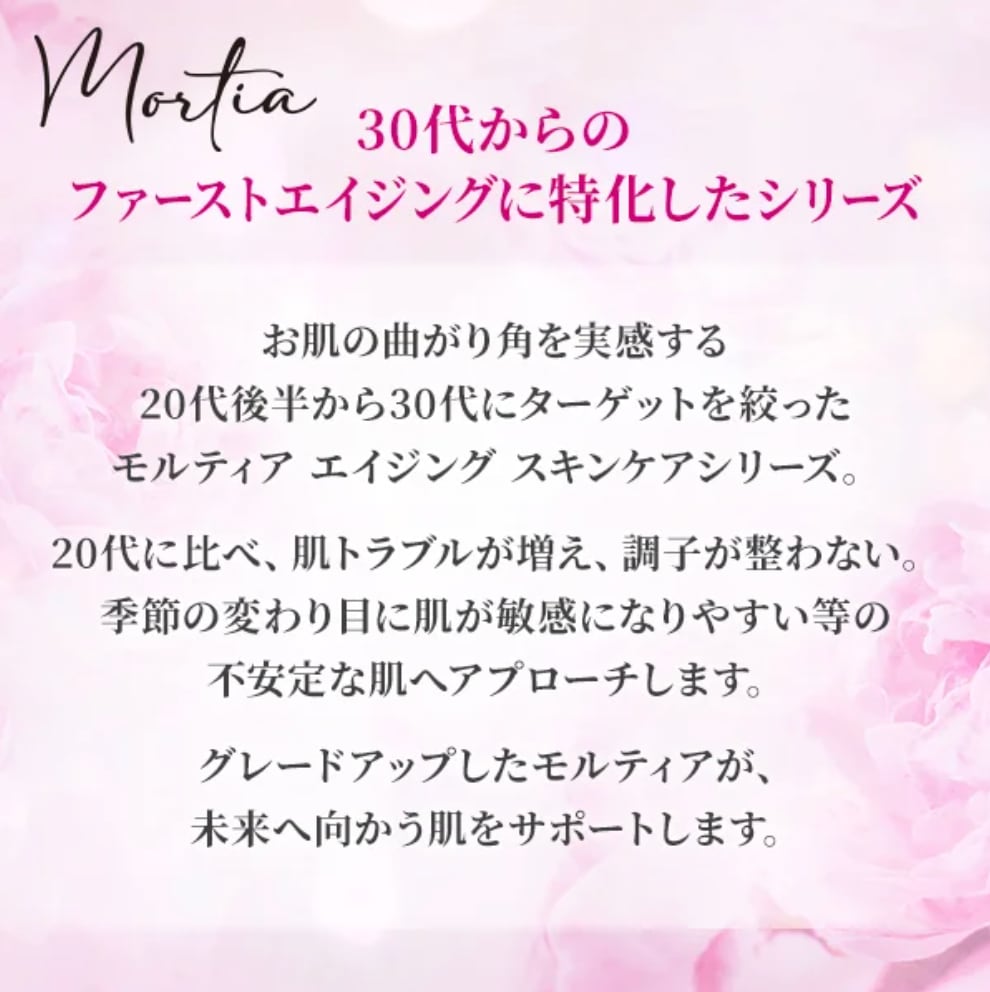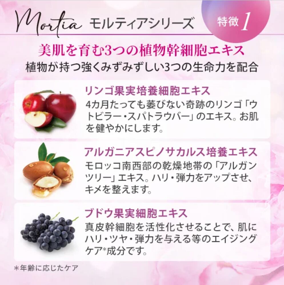 お肌本来の美しさを引き出す3つの植物幹細胞*とバラ*1の力がハリと潤いを与え美肌を導くモルティアシリーズ。