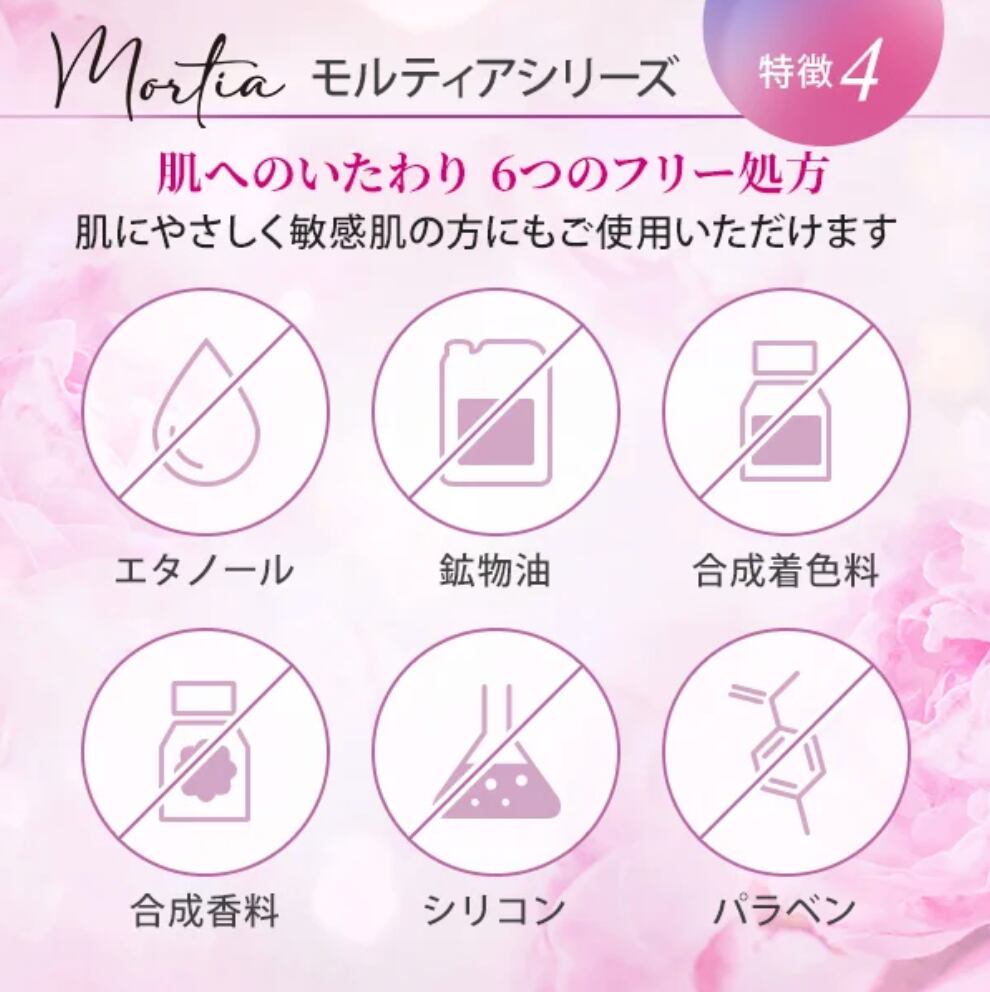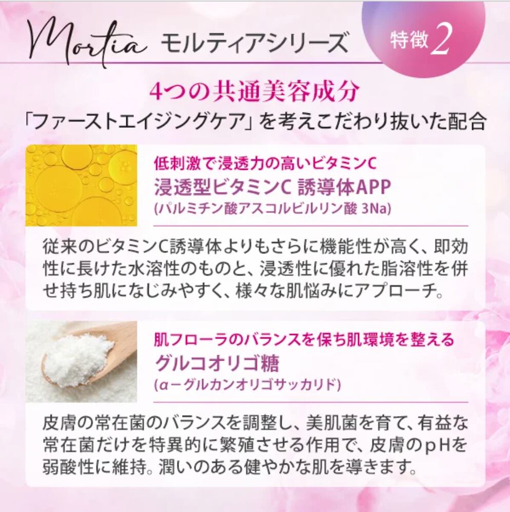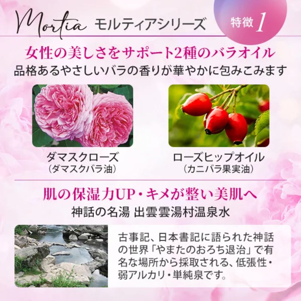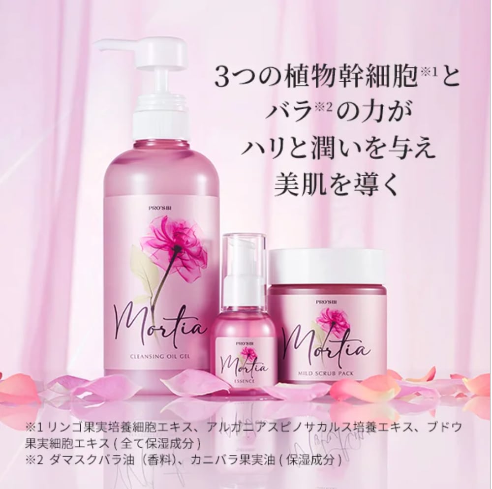 お肌本来の美しさを引き出す3つの植物幹細胞*とバラ*1の力がハリと潤いを与え美肌を導くモルティアシリーズ。