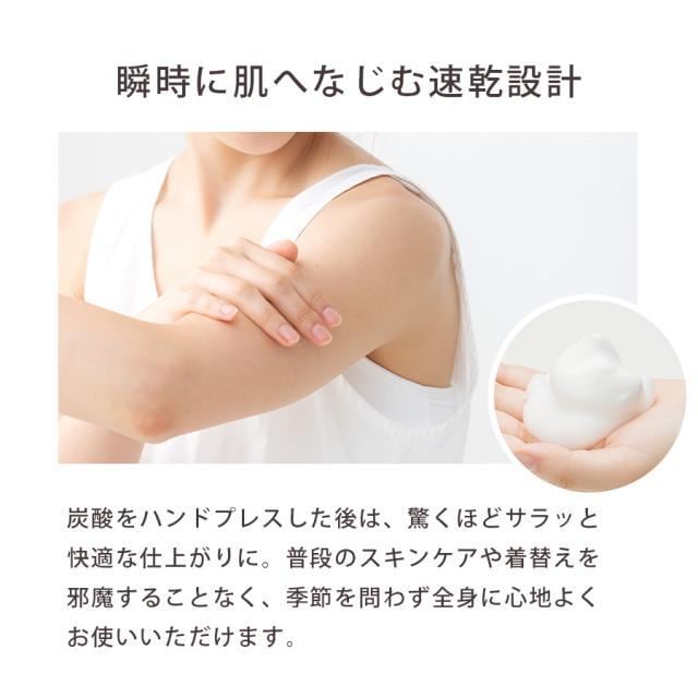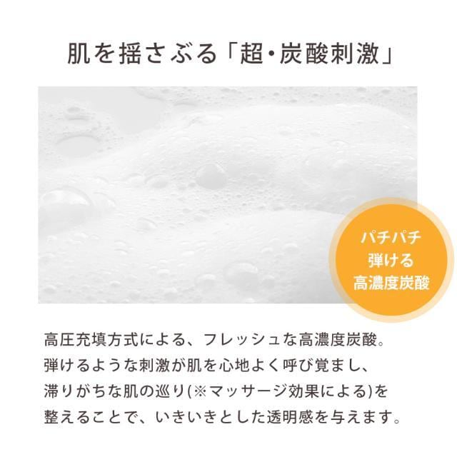 高濃度炭酸が肌を心地よく刺激。厳選された美容成分を角質層のすみずみまで届け、どんよりした印象をパッと晴らし、全身を健やかなコンディションへ。