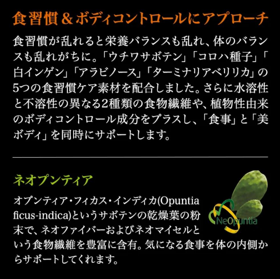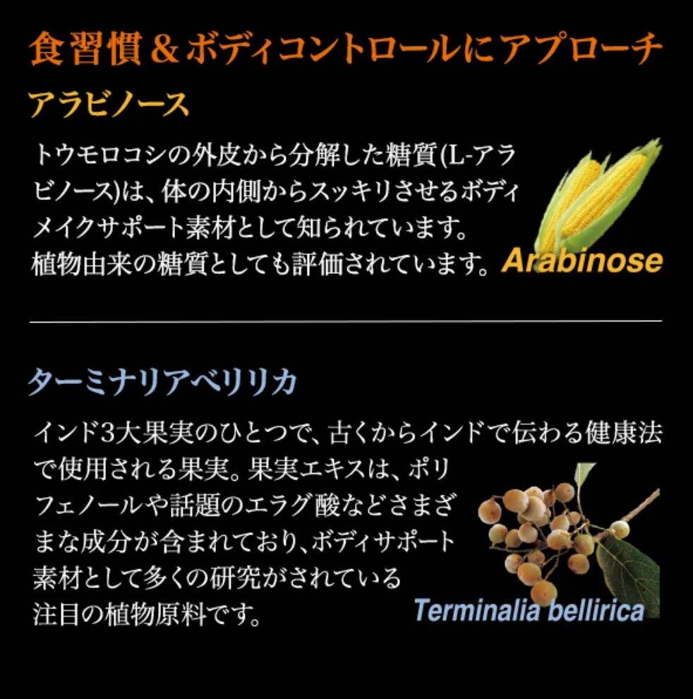 主要成分「ウチワサボテン」「コロハ種子」「白インゲン豆」「アラビノース」に加え「ターミナリアべリリカ」というインドのアーユルヴェーダで使われる果実の5つの成分が偏りがちな食事をサポート。
