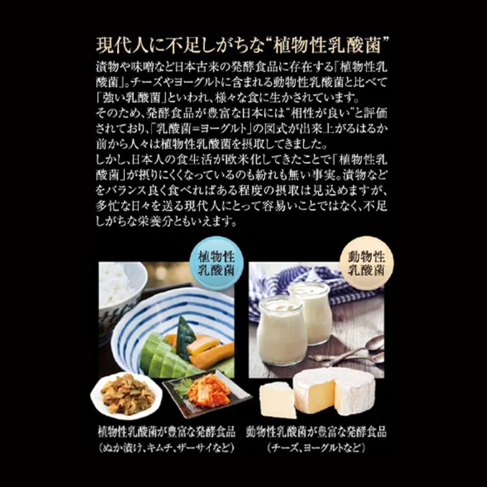 「フローラバランスEX グランプロ」は、日本古来の食文化から生まれた発酵食品の「植物性乳酸菌」にこだわって研究開発し、従来の乳酸菌とは一線を画した100%植物由来の乳酸菌サプリメントです。原材料には、塩を一切使わない長野県・木曽地方の伝統食“すんき漬け”由来の植物性乳酸菌と152種類もの国産植物由来の「酵母」を配合。近年脚光を浴びている「バイオジェニックス*2」に着目し、作られた植物由来の乳酸菌サプリメントです。